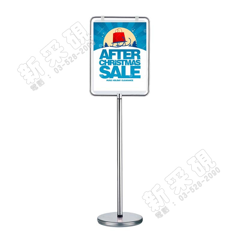 1.鬆開夾扣 2.放入壓克力板 (a.壓克力向上推入夾扣間隙;向下放入支桿頂端溝槽) 3.按下夾扣即可完成海報更換