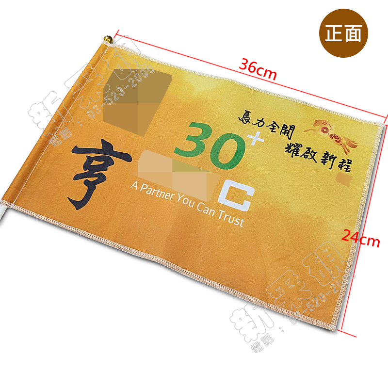 尺寸:24 x 36 cm 材質:雙透布 布管位置:左邊 可做為造勢活動或團體外出時使用 客製化印刷內容,可將訊息印製在旗面上 提升活動形像,增添氣氛,讓活動更熱鬧