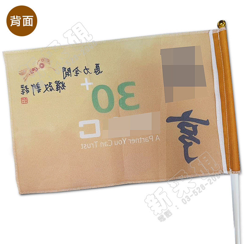尺寸:24 x 36 cm 材質:雙透布 布管位置:左邊 可做為造勢活動或團體外出時使用 客製化印刷內容,可將訊息印製在旗面上 提升活動形像,增添氣氛,讓活動更熱鬧